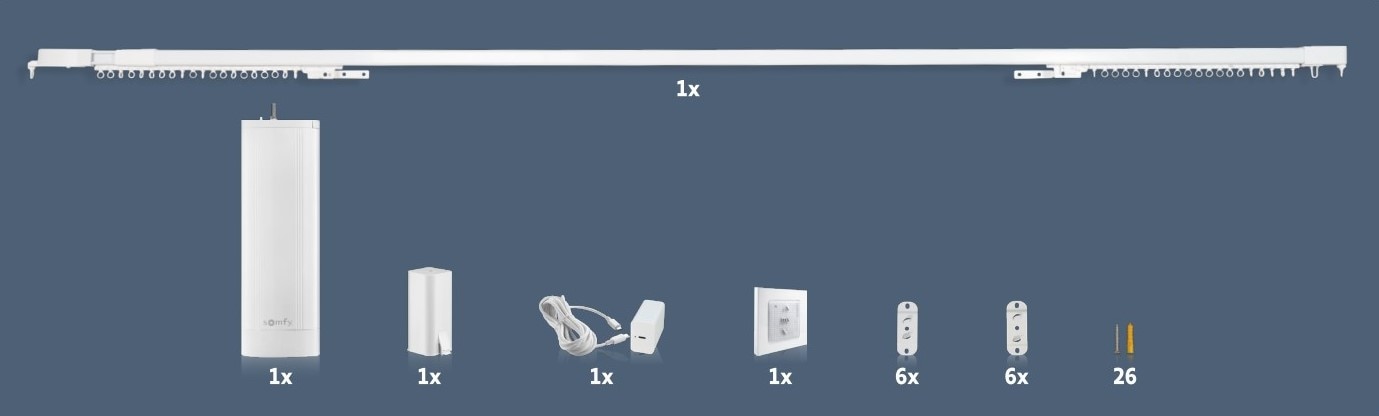 Napęd do zasłon Somfy zapewnia wygodę, elegancję i długotrwałą pracę, dzięki wytrzymałej baterii. Regulowana szyna od 2,3m do 4,0m. Napęd wyposażony jest w technologię RTS. Obsługuje większość typów zasłon do wagi 20kg. Zestaw nie zawiera haczyków potrzebnych do zamocowania zasłony do ślizgaczy, muszą zostać zakupione oddzielnie.