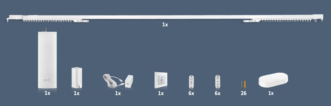 Napęd do zasłon Somfy zapewnia wygodę, elegancję i długotrwałą pracę, dzięki wytrzymałej baterii. Kompatybilności z systemem TaHoma umożliwia sterowanie swoimi zasłonami za pomocą smartfona lub pilota. Napęd wyposażony jest w technologię RTSoraz regulowaną szynę od 2,3m do 4,0m. Obsługuje większość typów zasłon do wagi 20kg. Zestaw nie zawiera haczyków potrzebnych do zamocowania zasłony do ślizgaczy, muszą zostać zakupione oddzielnie.